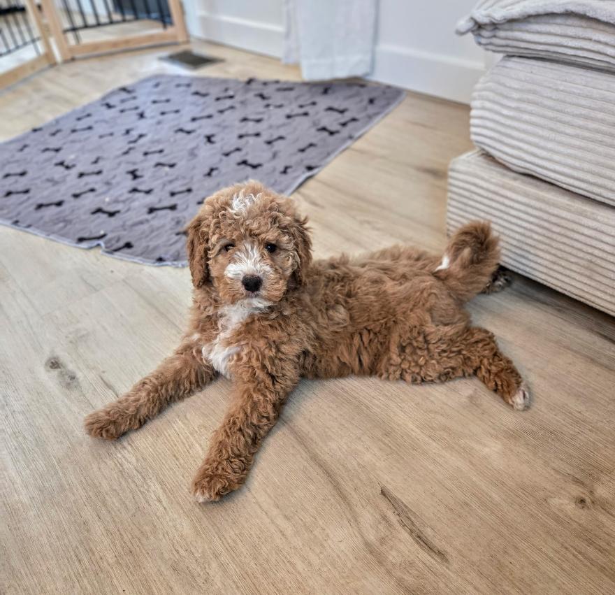 SADIE IS A MINI DUCK DOODLE! DUCK DOODLES ARE A CROSS BETWEEN A NOVA SCOTIA DUCK TOLLER AND POODLE. THEY ARE SIMILAR TO THE GOLDENDOODLE BUT HAVE A CALM, LOYAL DISPOSITION AND MAKE WONDERFUL FAMILY AND THERAPY DOGS! SADIE, IN MY OPINION, IS A PERFECT THERAPY CANDIDATE! SHE IS $2800
