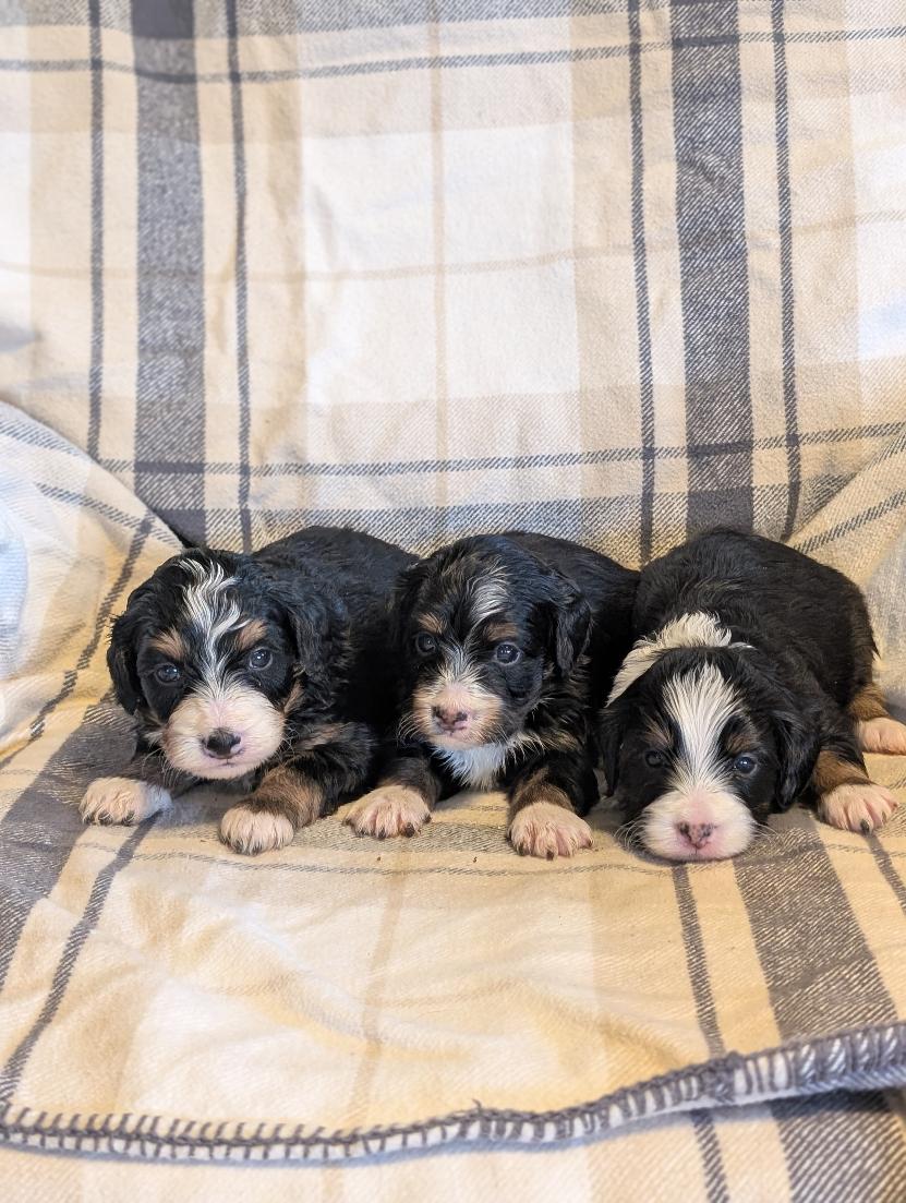 WE ALSO HAVE AVAILABILITY FOR TRI MINI BERNEDOODLES THAT ARE $3200. THERE ARE TWO TRI FEMALES AVAILABLE AT THIS TIME.